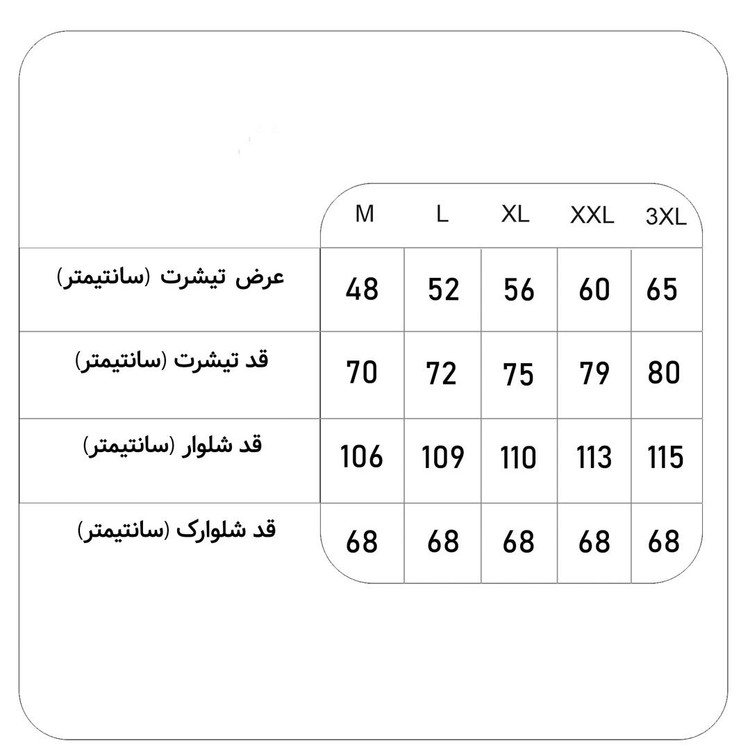 قد شلوار: لارج ۱۰۹، ایکس لارج ۱۱۰، دو ايکس لارج ۱۱۳