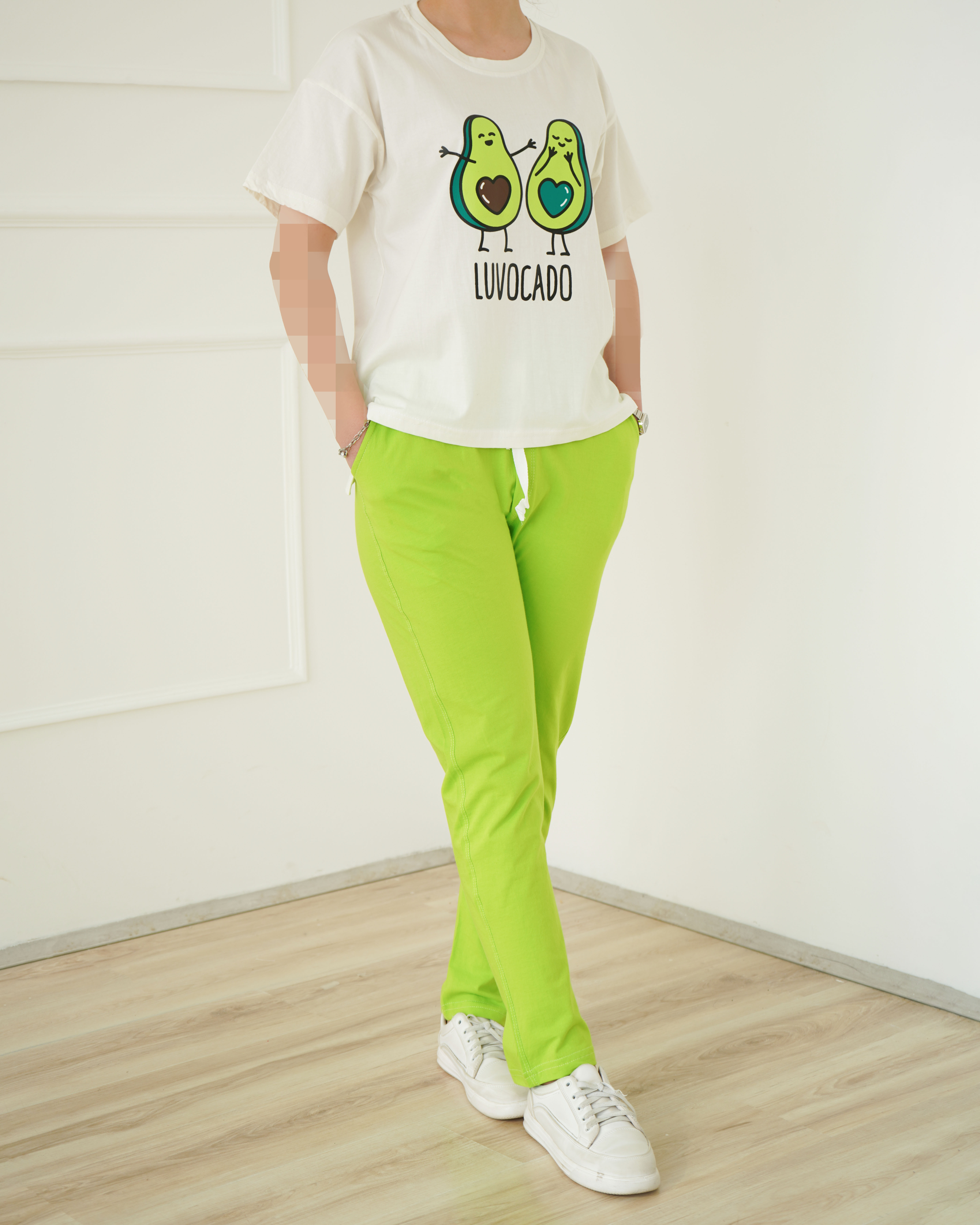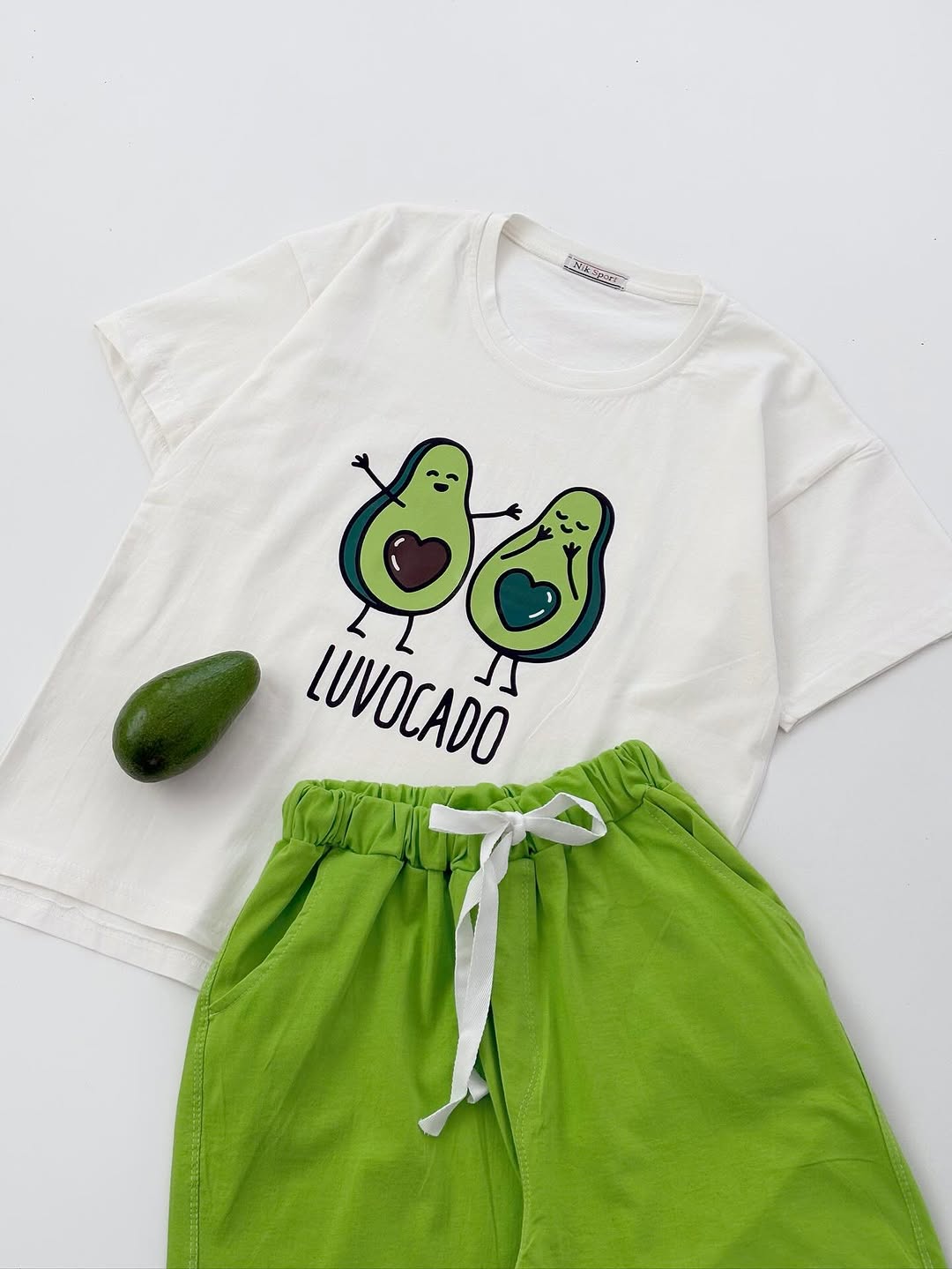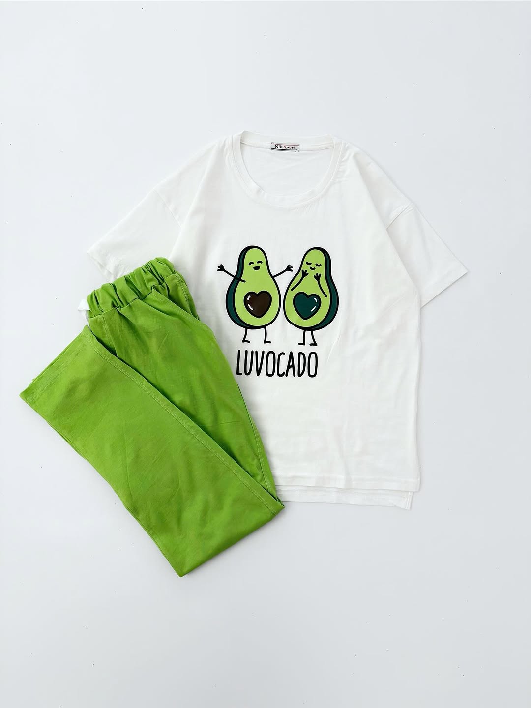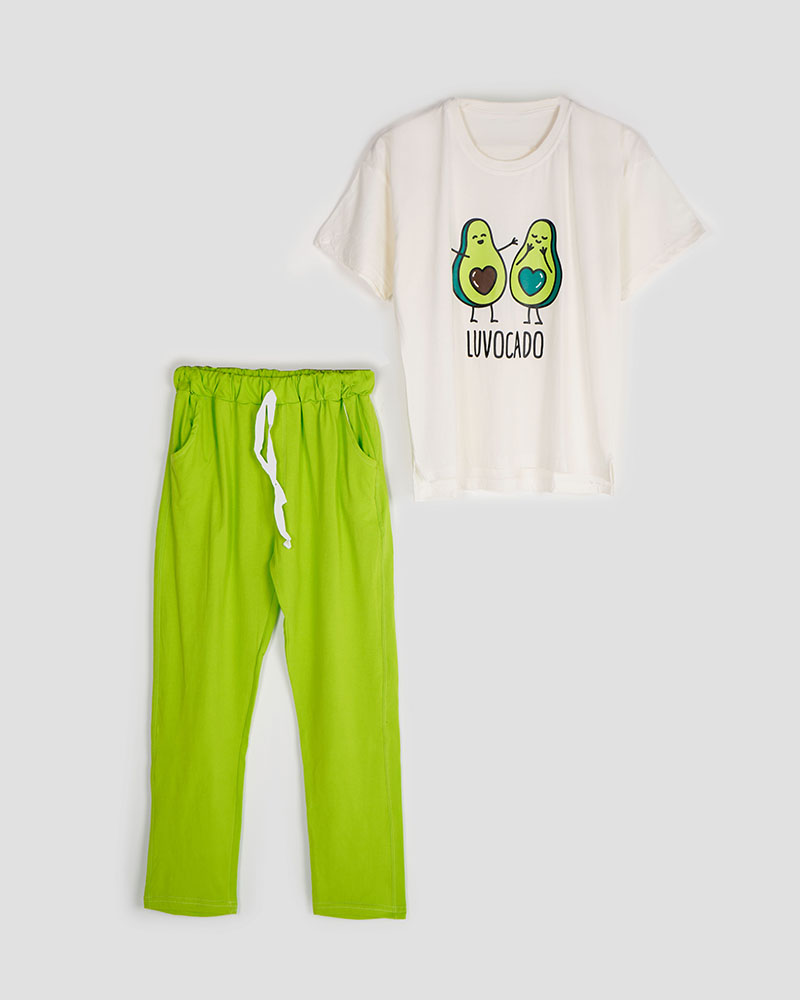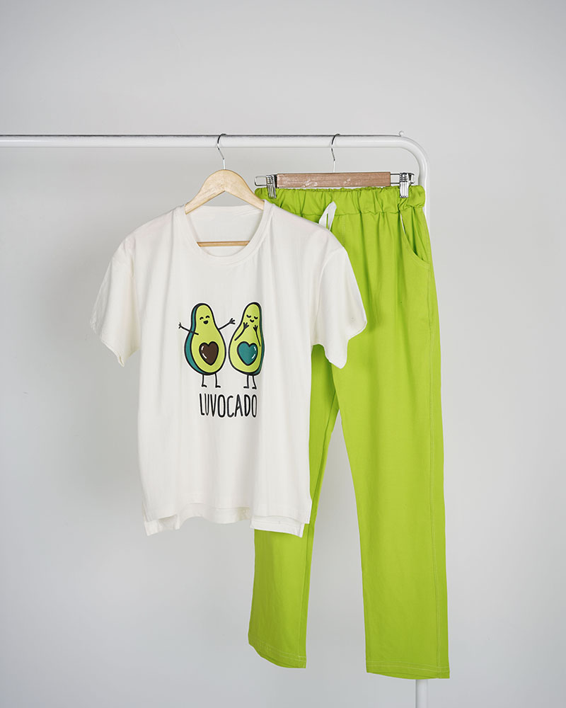 جنس تیشرت و شلوار نخ و پنبه می باشد. تیشرت یقه گرد و آستین کوتاه می باشد. طرح های روی ست چاپی هستند. کمر شلوار تماما کشی بوده و بند دور کمر کاربردی است. تک رنگ فری سایز است و جدول سایزبندی در گالری تصاویر است
